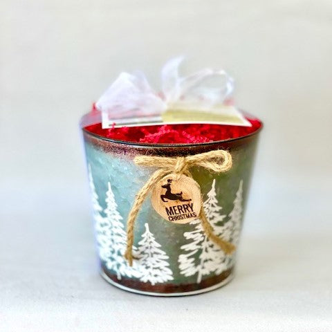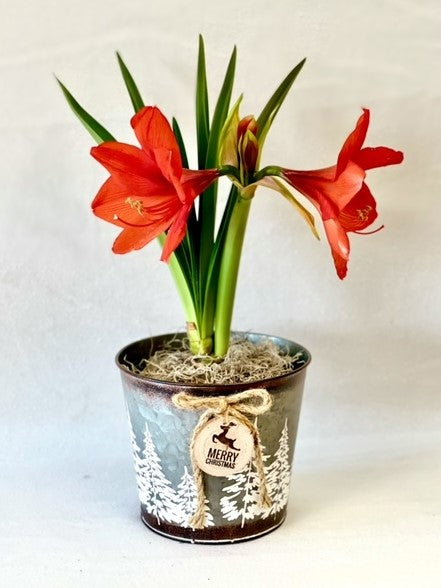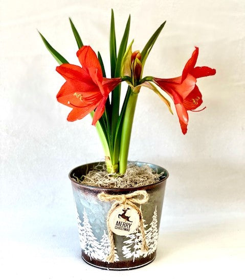 The Timberland Pot Cover features a snowy, rustic scene with Merry Christmas wishes.  Arrives with your choice of red, white, or striped amaryllis already planted and topped with a festive holiday ribbon and your personalized gift message.