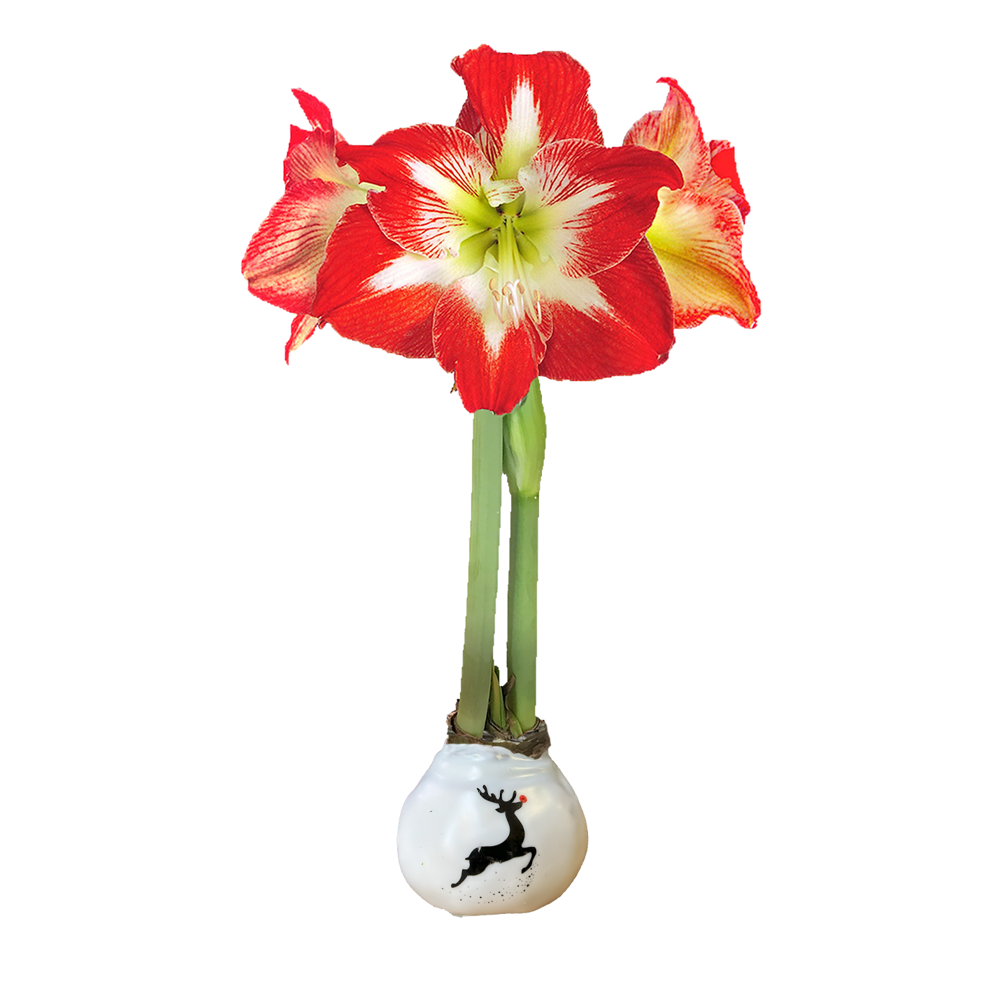 The Reindeer bulb features a jumping reindeer on white wax with a red and white "Minerva" amaryllis flower.